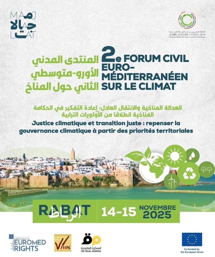 أطلق المنتدى المدني الأورو-متوسطي الثاني حول المناخ، المنعقد بالرباط يومي 14 و15 نوفمبر 2025، “إعلان الرباط 2025″، الذي يُعد خارطة طريق للتعاون الإقليمي في مواجهة التغيرات المناخية وتعزيز العدالة المناخية والانتقال العادل في الفضاء الأورو-متوسطي