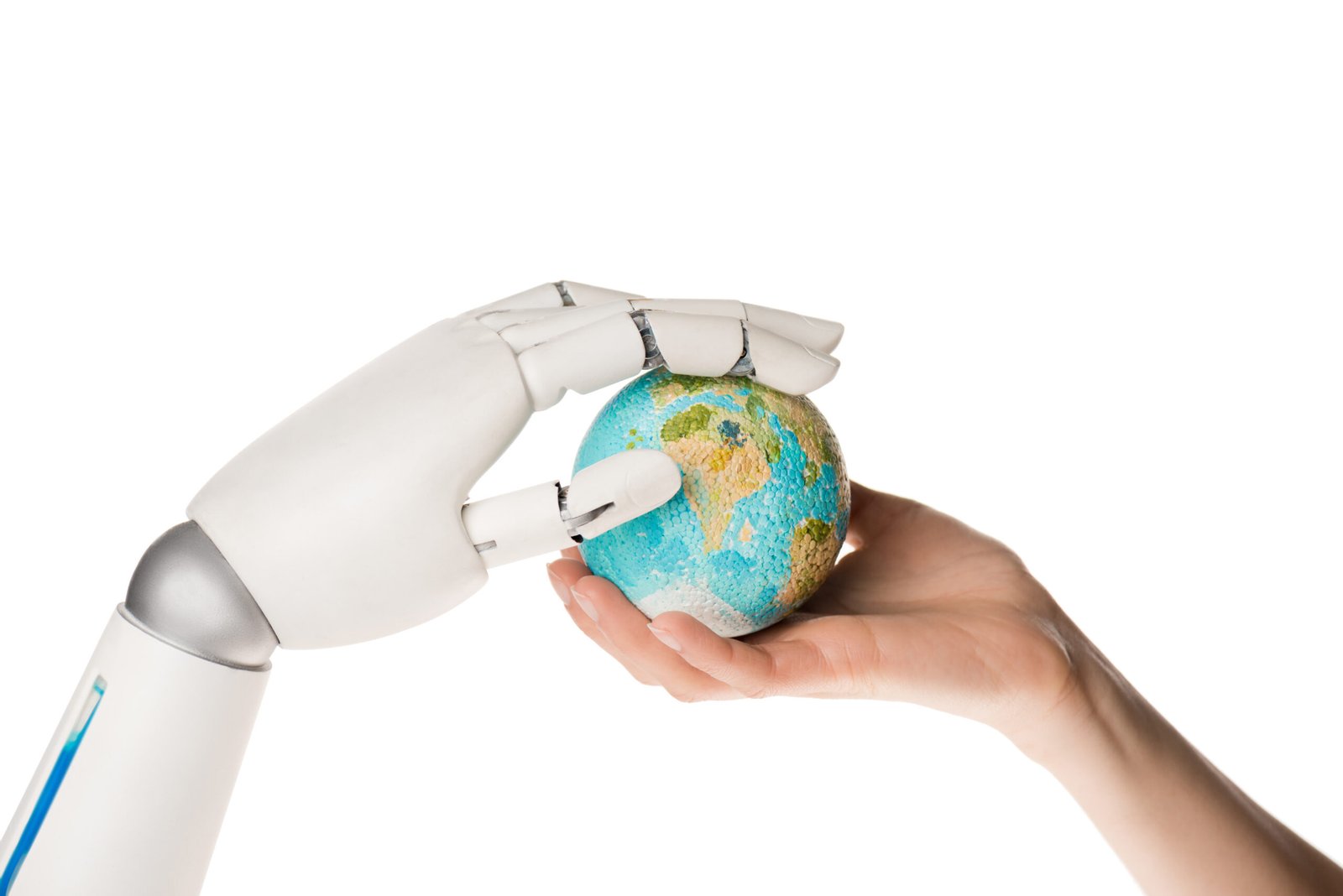 cropped shot of robot and human holding miniature model of earth isolated on white
