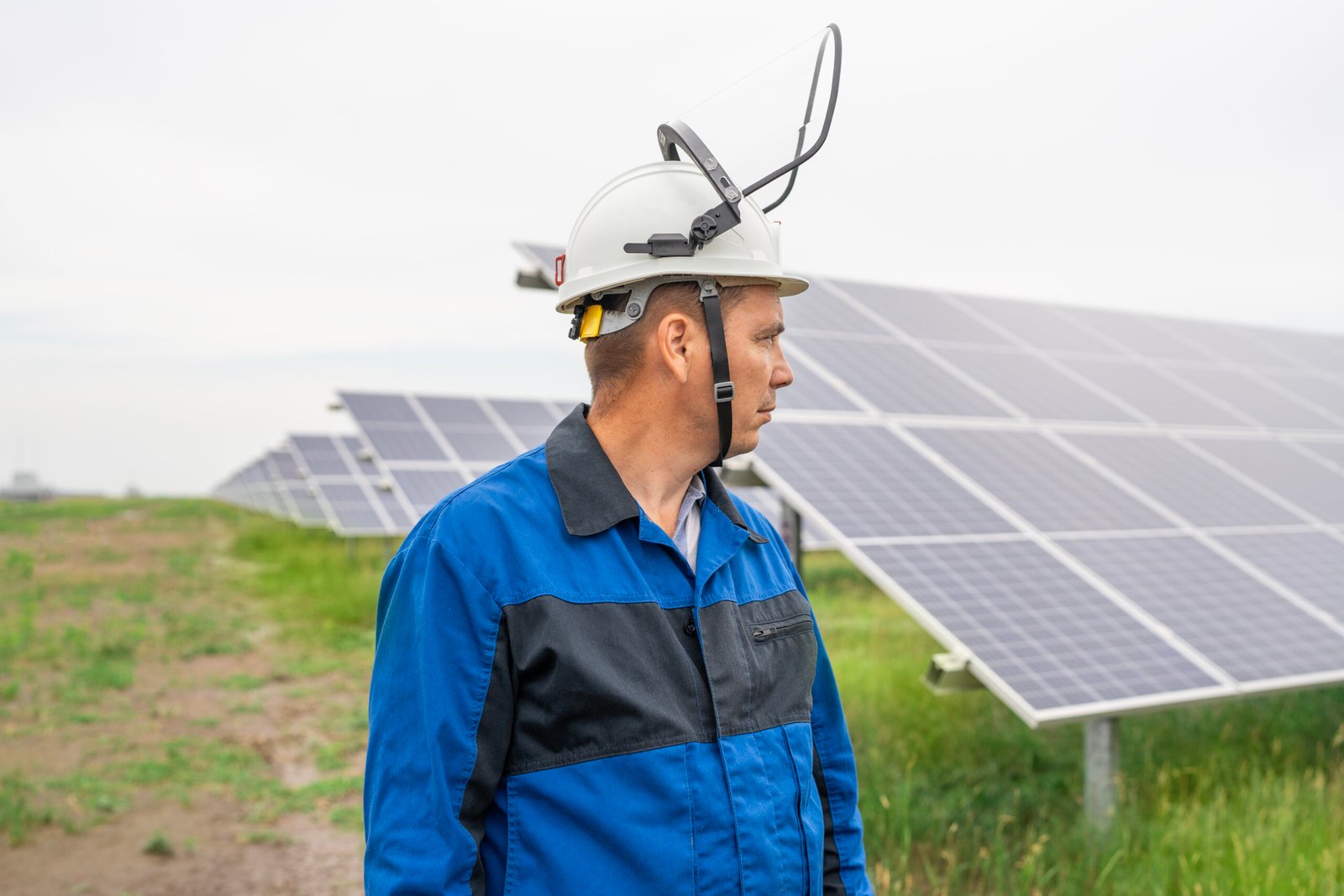 Service Engineer man standing with arms crossed in front of solar panels. Technician maintenance solar cells on Solar Energy Plant under morning sunlight. Technology solar energy renewable.